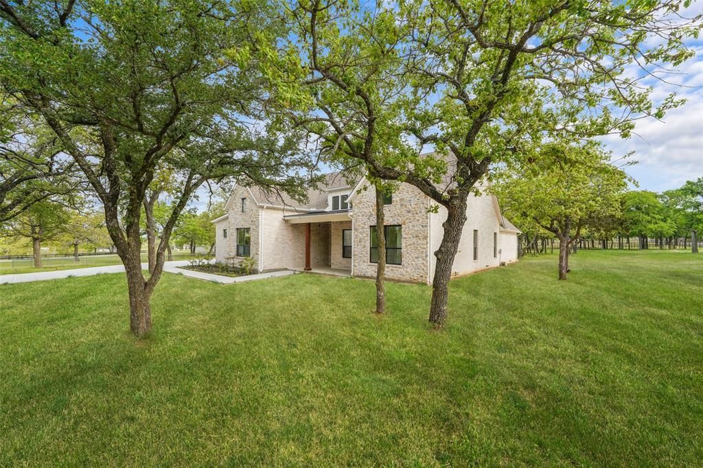Welcome to Bluebonnet Ridge—one of Weatherford’s most desirable communities offering NO HOA, horses allowed, and true Texas living. Situated on a beautifully fenced 2-acre corner lot, this stunning new build blends upscale design with peaceful country charm just minutes from town. This 5-bedroom, 3-bath home features a split-bedroom layout and open-concept design ideal for everyday living and entertaining. The chef’s kitchen showcases a large island, custom white oak cabinetry, quartz countertops, decorative lighting, built-ins, wine bar, and hidden pantry, all flowing into the living room with a cozy fireplace. The private primary suite offers 12’ ceilings, a spa-like retreat with direct access to the laundry room from your closet. Secondary oversized bedroom with 12’ cathedral ceilings overlooks the heavily treed backyard and filled with abundant natural light. Additional bedrooms are thoughtfully designed, including a Jack-and-Jill bathroom, offering both convenience and privacy for family or guests. Additional highlights include spray foam insulation, solid core doors, walk-in closets, and energy-efficient upgrades. Enjoy Texas outdoor living with a 10’ sliding glass door opening to expansive covered patios—perfect for relaxing or entertaining under mature oak trees. Located just off Tin Top Rd and only minutes from Weatherford, with the Brazos River nearby for outdoor recreation. Space, style, and freedom—your ranch lifestyle starts here. Schedule your showing today!
