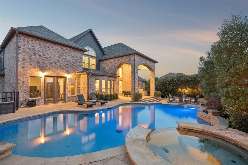 Experience refined luxury in this stunning brick-and-stone estate, where timeless architecture & upscale finishes create an unforgettable first impression. A grand arched iron entry opens to a dramatic foyer w-soaring ceilings, rich hardwood floors, & a sweeping staircase w-iron balusters. The expansive living rm is filled w-natural light & showcases exposed wood beams, a floor-to-ceiling stone fireplace, & walls of windows that enhance the home’s elegant yet inviting atmosphere. Designed for both everyday living & entertaining, the chef’s kitchen features custom cabinetry, granite countertops, a large center island w-farmhouse sink, ss appliances, dbl ovens, a gas cooktop, & designer lighting. The open-concept layout flows seamlessly into the dining & living spaces, offering both comfort & sophistication in every detail. A beautifully designed private office creates an inspiring work-from-home setting. The guest bed is thoughtfully appointed w- soft neutral walls, & timeless plantation shutters, providing a serene & inviting space for overnight visitors. The main floor game rm adds exceptional versatility, offering an expansive area ideal for entertaining, media, or gym. The elegant primary suite is a true private retreat that features a luxurious spa-inspired bath beautifully appointed w-dual vanities, granite countertops, rich custom cabinetry, a soaking tub, & an oversized glass-enclosed walk-in shower wrapped in timeless marble-look tile. 3 beds, Game, Media & Beverage center up! Step outside to your own private backyard oasis, where resort-inspired amenities create the perfect setting for entertaining and everyday enjoyment. This exceptional outdoor space features a sparkling pool w-raised spa, expansive stone patio, multiple conversation areas, a dedicated fire pit lounge, & an impressive covered outdoor living area w-built-in grill. Framed by lush landscaping & designed w-both comfort & style in mind, this backyard is an extraordinary extension of the home.