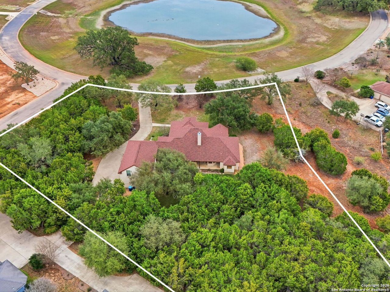 Situated on an oversized 1.84-acre corner lot directly across from the neighborhood pond, this Rockwall Ranch property offers a rare combination of space, setting, and low taxes. Mature trees and generous lot size create a Hill Country feel while remaining conveniently close to both New Braunfels and San Antonio. The home features nearly 3,000 square feet, with a flexible layout that includes three bedrooms, a dedicated office, and a large game room. The main living area is anchored by a stone fireplace and opens to the kitchen and breakfast area, creating an easy flow for everyday living and entertaining. High ceilings, generous windows, and neutral finishes provide a bright, move-in-ready backdrop. The kitchen offers abundant storage, an island, built-in appliances, and a walk-in pantry. The primary suite includes dual vanities, a soaking tub, separate shower, and walk-in closets, while a secondary bedroom on the main level provides additional flexibility. Rockwall Ranch is known for its scenic Hill Country setting and amenities, including a pool, clubhouse, tennis courts, playground, and walking trails. Enjoy the sense of being tucked into the hills while still having easy access to shopping, dining, and major corridors in New Braunfels and San Antonio. With a low tax rate, expansive lot size, and pond views just steps from the front door, this property presents an exceptional opportunity in one of the areas most established neighborhoods.