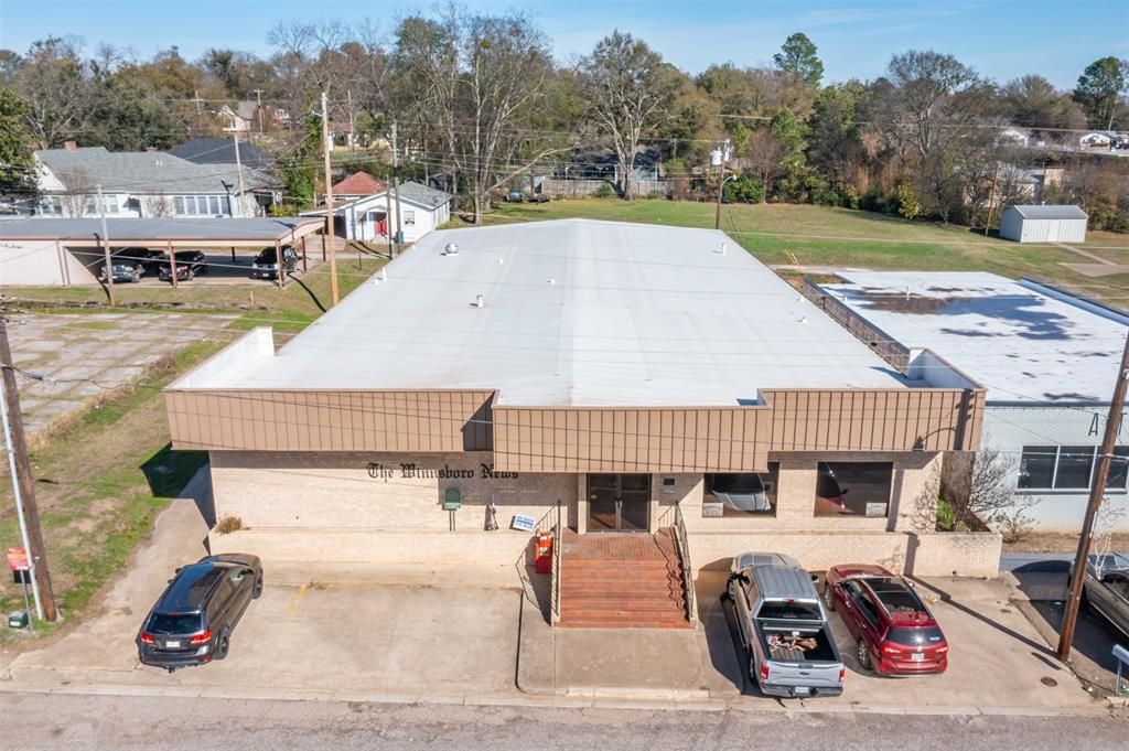 Now available, 10,293 SF flex industrial-office building located in the heart of Downtown Winnsboro. The building was most currently used as a production office and warehouse for the local newspaper. This adaptable property offers a rare combination of office, warehouse, and creative-use space on a 0.3329-acre lot, making it ideal for a wide range of commercial, professional, or specialty concepts.The building features a large lobby and reception area, multiple private offices, breakroom, and restrooms, providing a functional layout for service-based or administrative operations. A dedicated warehouse area with loading dock supports storage, distribution, production, or maker-space uses. Flooring includes both concrete and carpet, and the property is equipped with central HVAC for year-round comfort. Located just steps from Main Street, the site offers excellent access to nearby retail, restaurants, banking, and essential services, enhancing convenience for employees and customers. The flexible footprint supports a wide range of potential uses, including professional services, creative studios, boutique retail, wellness concepts, remote-work hubs, hybrid retail-workshop models, and specialty commercial operations.With immediate availability and a versatile floorplan, 105 Locust Street is a strong fit for business owners or investors seeking a centrally located, multi-use commercial property in a growing Northeast Texas market.