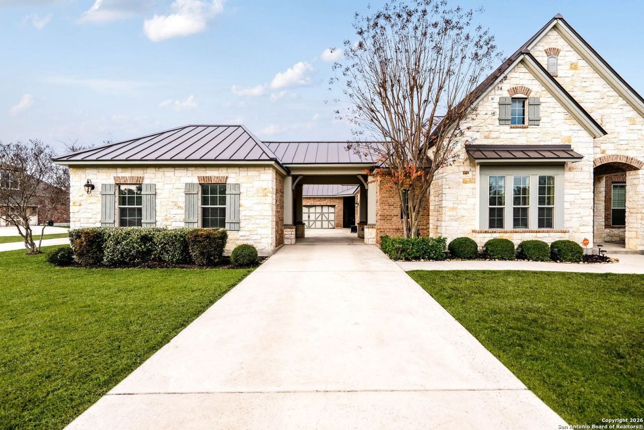 This beautifully designed two-story Texas Hill Country-style home sits on a generous 1.10-acre partially wooded cul-de-sac lot, offering privacy, space, and scenic surroundings. The home features 4 bedrooms and 3.5 bathrooms and includes thoughtful upgrades such as a tankless water heater, water softener, and a durable metal roof installed in August 2022. The interior has been freshly painted, creating a bright and move-in-ready atmosphere throughout. The well-planned main level includes the living room, family room, study/office, kitchen, dining room, utility room, and the primary suite, along with additional bedrooms that allow for convenient main-level living. A striking stone-accented fireplace adds warmth and character to the living room. Outdoor features include a covered porch and a dedicated hot tub pad that is prewired and ready for use, along with mature trees, a sprinkler system, and wrought iron fencing along the front of the property. The home offers exceptional parking and storage with a two-car garage located off the breezeway and an additional three-car garage off the back porch, both connected by covered walkways. Conveniently located near schools, the home also provides access to community amenities such as a clubhouse, controlled access, pool, tennis courts, jogging trails, basketball court, and park/playground-creating a perfect balance of luxury, functionality, and Hill Country charm.