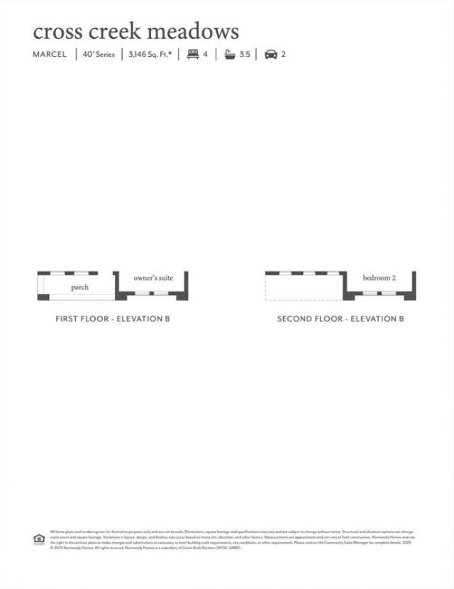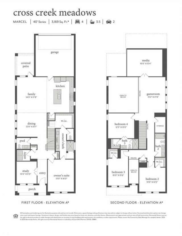 NORMANDY HOMES MARCEL floor plan. The Marcel is a beautifully designed home offering over 3,100 square feet of living space with four bedrooms and three and a half bathrooms. The main floor includes a luxurious owner's suite and a dedicated study, perfect for those who need a quiet workspace. The two-story family room provides an impressive central gathering space. You'll find a spacious game room and media room upstairs, ideal for entertainment. Each bedroom features a walk-in closet, ensuring ample storage for all. One bedroom upstairs has a private full bathroom. Built with quality materials and smart design, this home delivers both style and durability at a great value, making it the perfect choice for those seeking an affordable home without compromising on craftsmanship. Come see for yourself why this is one of the most popular homes we offer!