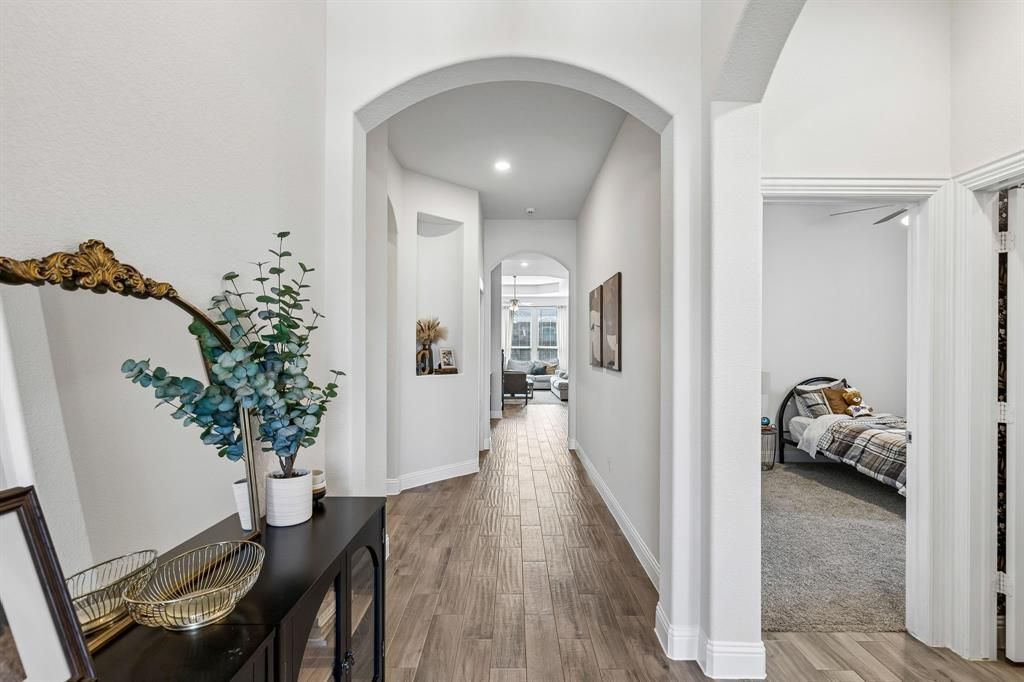 Located in the highly sought-after Silverado community, 11220 Blaze showcases a perfect blend of modern elegance and comfortable living. This beautifully designed home welcomes you with a spacious open-concept floor plan filled with abundant natural light, enhanced by decorator touches throughout that add style and sophistication. The gourmet kitchen is the heart of the home, featuring sleek quartz countertops, stainless steel appliances, and ample cabinetry, all seamlessly flowing into the living and dining areas - ideal for entertaining. The private primary suite offers a peaceful retreat with a spa-like ensuite bath complete with dual sinks, a relaxing garden tub, separate shower, and a generous walk-in closet. Three well-appointed secondary bedrooms provide comfort and flexibility, perfect for family, guests, or a home office setup. These rooms are served by a full guest bath, thoughtfully designed to accommodate both everyday living and visitors. Upstairs, a spacious game room with a built-in Murphy bed and full bath creates a versatile space ideal for a media room, guest suite, or additional living area. The upstairs bath is beautifully finished with a decorator mirror and stylish gold fixtures, adding a touch of elevated design. Step outside to a backyard oasis complete with a covered patio - perfect for relaxing or entertaining year-round. Residents of Silverado enjoy exceptional resort-style amenities, including a community pool with splash area, clubhouse, pickleball and basketball courts, dog park, scenic walking trails, multiple parks, playground, and a charming pergola for gatherings. Conveniently located near Highway 380 and the Dallas North Tollway, this home offers easy access to shopping, dining, and major employment centers across North Texas.