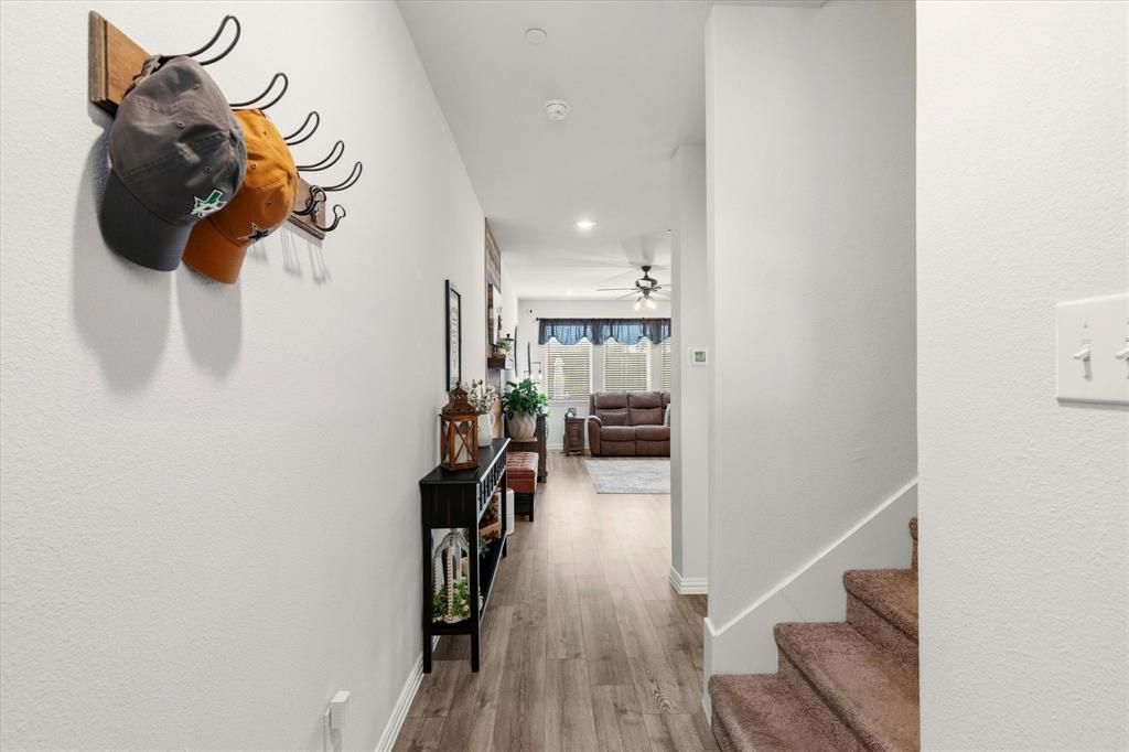Welcome to this beautifully maintained 3-bedroom, 2.5-bath townhome in the desirable Heritage Trails community of Lewisville, built by Gehan Homes (now Brightland Homes). Offering 1,719 sq ft, this home features the upgraded Acadia floor plan, which adds direct access to the secondary bathroom from one of the secondary bedrooms, providing added convenience and functionality.The bright and open living space is filled with natural light and showcases luxury vinyl flooring downstairs, upgraded decorative lighting, ceiling fans, and a custom wood accent wall with mantel that creates a warm focal point in the living room. The kitchen offers a walk-in pantry, ample cabinetry, and a layout ideal for everyday living and entertaining.Upstairs, the primary suite features double sinks, a spacious shower with built-in bench, and a walk-in closet. Secondary bedrooms also include walk-in closets, providing excellent storage. Upstairs flooring includes carpet with tile in wet areas.Enjoy low-maintenance outdoor living with a backyard that backs to a peaceful greenbelt, offering added privacy and views. The yard features artificial turf and fence lighting, creating a relaxing outdoor space perfect for entertaining or unwinding in the evenings.Located in the Heritage Trails community, residents enjoy access to a community pool, dog parks, and green spaces. Lake Lewisville is approximately one mile away, offering boating, fishing, and outdoor recreation. The home also provides easy access to I-35, making commuting convenient while being close to shopping, dining, and entertainment in Lewisville.This like-new home has been meticulously cared for and lovingly maintained, offering low-maintenance