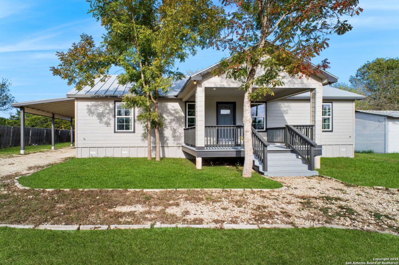 Brand-new construction in Bandera offering modern style, thoughtful design, and effortless Hill Country living. This 3-bedroom, 2-bath home welcomes you with luxury vinyl plank flooring throughout, vaulted ceilings in both the living room and primary suite, and recessed lighting that creates a bright, airy atmosphere. The chef-inspired kitchen features quartz countertops, a spacious island with a prep sink, farmhouse stainless steel sink, glass tile backsplash, and all-new appliances, including a stove, microwave, dishwasher, and refrigerator. Dual pantry closets provide excellent storage and organization. The private primary suite offers a relaxing retreat with high ceilings, a walk-in shower, dual sinks, and an impressive walk-in closet with custom shelving. The home also features a convenient attached side carport for easy parking, a welcoming covered front porch, and a spacious covered back patio deck-perfect for outdoor dining, entertaining, or enjoying quiet evenings. This thoughtfully built home blends comfort, function, and modern finishes-ready for you to move in and Love Where You Live in the heart of Bandera.