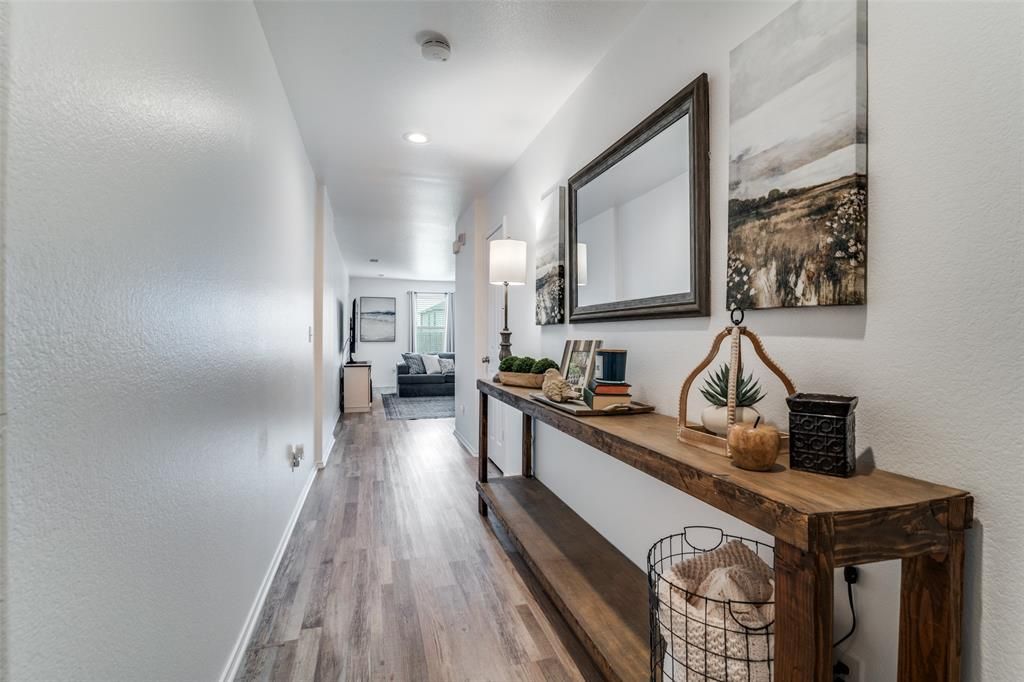 Welcome home to this single-story gem located in the quaint town of Fate! Step into the foyer with new luxury vinyl flooring leading to the spacious guest bedrooms and full guest bath with an updated vanity and mirror. The kitchen is the heart of the home with a butcher block island, extra large sink, pendant lighting and custom hardware. The oversized living room is perfect for movie nights and overlooks the large backyard with covered patio and storage shed. The private primary bedroom includes a walk-in closet and remodeled en-suite bathroom with new dual-sink vanity and mirror. Roof is only one year old! Other upgrades include: New light fixtures and fans throughout; Shelf and wallpaper in laundry room; New interior and exterior paint; Shelves added in primary closet and garage, and more!