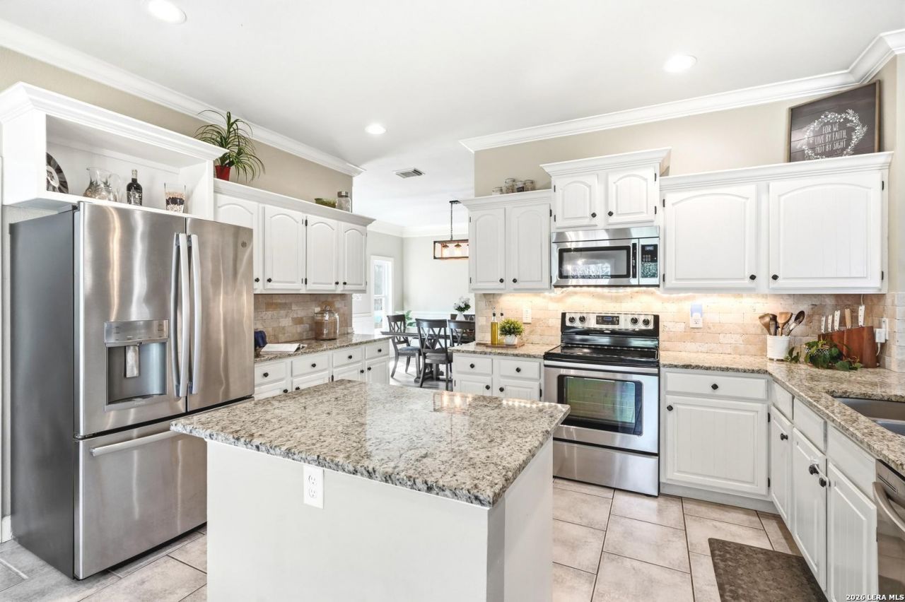 WELCOME HOME to this beautifully updated home in Oro de Coronado. The light-filled layout features 4 bedrooms, 2.5 bathrooms, a dedicated office, and a formal dining area, offering maximum flexibility for living and entertaining. The island kitchen serves as the heart of the home with granite countertops, stainless appliances, and generous prep space, flowing into an inviting family room with a wood-burning fireplace and sliding doors that open to the outdoor living area, creating a seamless extension of space. Upstairs, you will find three spacious secondary bedrooms, a versatile game room, and a serene primary suite that offers a private retreat with a large walk-in closet and a spa-inspired bath featuring an oversized walk-in shower, custom cabinetry, and granite countertops. Major recent upgrades include all new windows in 2022, updated flooring in 2022, a replaced water heater, water softener, the garage is equipped with a 240V outlet suitable for EV charging, and so much more! The private backyard is designed for year-round enjoyment with a covered patio featuring a durable metal roof. With no HOA and a prime location, it has easy access to I-35, I-10, 1604, Randolph AFB, Fort Sam Houston, major hospitals, and the airport. This home offers the ideal blend of modern updates and a perfect location for commuters to San Antonio, New Braunfels, or Austin. Dont miss out!