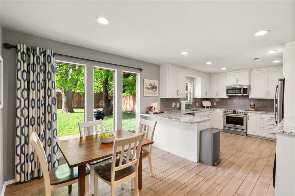 Just 15 minutes from downtown Fort Worth with easy access to Interstate 20, this charming 3-bedroom, 2-bath home in Benbrook offers the perfect blend of convenience, character, and everyday comfort. Tucked beneath mature shade trees, this home welcomes you with warmth and timeless appeal. Step inside to a spacious living room featuring a vaulted ceiling with beams and a striking wood-burning fireplace with a raised brick hearth simply perfect for cozy evenings or gathering with friends and family. The kitchen offers granite countertops, an inviting eat-in dining space, and a thoughtfully designed hidden laundry area tucked beneath a granite folding counter - an upgrade from many homes. Privately situated at the rear of the home, the primary suite offers peaceful views of the backyard and two closets. In addition it has a spacious ensuite bath complete with dual sinks, a linen closet, and shower providing both comfort and functionality. One of the secondary bedrooms features custom built-ins, making it ideal for a home office, children’s room, or additional organized storage. Each secondary bedroom included a walk in closet. Situated on a .21-acre lot, the backyard provides plenty of space to relax, entertain, or create your own outdoor retreat, all shaded by beautiful, established trees. The covered patio, complete with electrical, is perfect for outdoor gatherings, grilling, or simply enjoying a quiet evening outside. The garage includes additional storage space, giving you flexibility for hobbies, tools, or seasonal items. Recent updates include a full electrical box replacement within the past year, offering peace of mind for the next homeowner. Enjoy nearby parks, trails, and local dining while still being close to everything. This home is perfect for buyers who value character, functionality, and proximity all wrapped into one inviting Benbrook property.