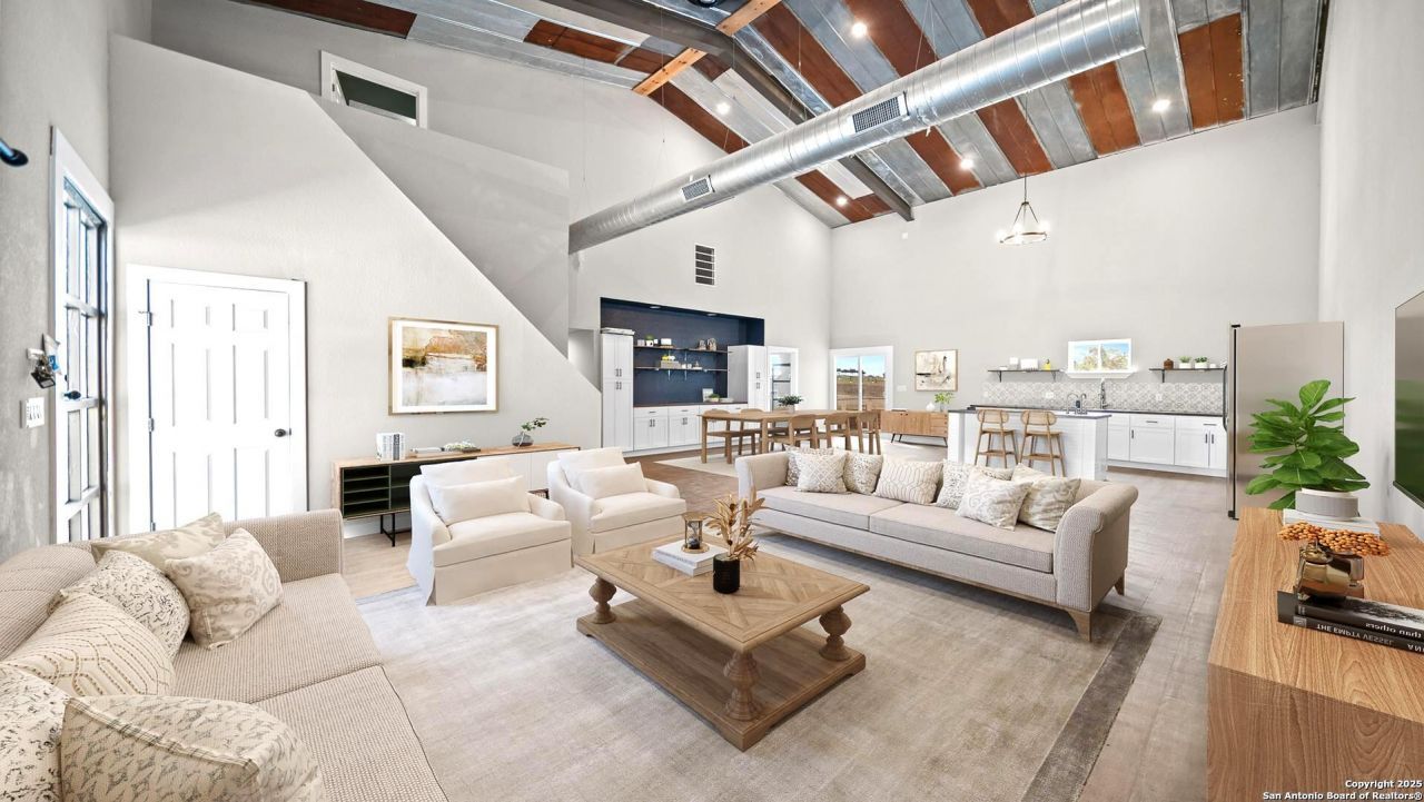 Discover the charm of the countryside with this expansive and contemporary barndominium situated on five acres within the highly desirable Lake Valley Estates subdivision and served by the equally sought out La Vernia Independent School District. This remarkable residence features one of the most substantial living spaces in the area, encompassing nearly 3,600 square feet. It offers seven bedrooms and three full bathrooms, with the versatility of two upstairs rooms that can also serve as a home office and an inviting media room. Uniquely, this property in La Vernia is equipped with its own well, a reverse osmosis water purification system, and a septic system. Upon entering through the custom iron front door, you are welcomed by soaring 22-foot ceilings in the great room. The open floor plan provides an abundance of space for entertaining, making it ideal for large gatherings, and includes a coffee bar with generous cabinet storage. The kitchen features custom cabinetry complemented by butcher block countertops throughout. The spacious primary bedroom boasts a custom ceiling with recessed lighting and adjoins via two great sliding barn doors a palatial bathroom complete with a vaulted walk-in rain shower and a separate tub, offering a serene retreat. The first floor comprises three bedrooms and two full bathrooms, while the second floor includes one full bathroom and four additional rooms, two of which can be adapted as an office and an entertainment space such as a media, pool, or playroom, offering numerous possibilities. The property also features a rear deck within a fully fenced inner backyard and a partially fenced outer border, perfect for enjoying the tranquility of the countryside and stargazing. A significant grove of oak trees on the property presents various opportunities, such as a treehouse or a picnic area. For those with a passion for gardening, a designated planting bed is available. Furthermore, the property offers ample storage space for equipment with three separate sheds, all monitored by a security camera system. This exceptional property, with its substantial lot and living area, presents a wealth of potential for its future owner. We encourage you to schedule a visit to experience it firsthand.