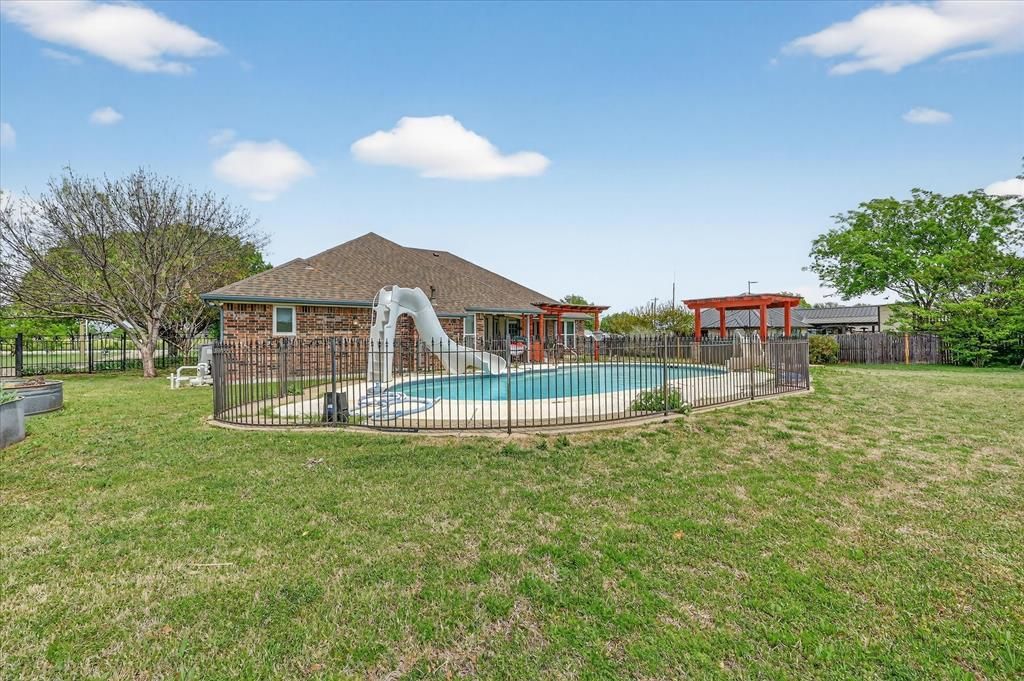 This spacious 4-bedroom, 3-bath home on 2.5 acres offers the perfect blend of comfort, functionality, and outdoor living. Designed with family in mind, the home features two living areas and two dining spaces, plus an open kitchen with breakfast bar, walk-in pantry, abundant cabinetry, and extensive storage. The refrigerator conveys, adding value and convenience. The primary suite is a true retreat, featuring a sitting area, private access to the covered patio, hot tub and pool, and a well-appointed bath with dual vanities, separate shower, and garden tub. A guest bedroom and full bath with exterior pool access create an ideal setup for entertaining or multi-generational living. Step outside to your private backyard oasis, complete with an inground gunite diving pool with two slides, a covered patio, and a hot tub under a pergola—perfect for relaxing or hosting guests. Also included are raised garden beds and a drive-through electric gate providing convenient access to the property. Additional features include a 20x30 insulated shop with overhead door and 10x30 awning, a 10x12 storage building, pipe fencing, and a sprinkler system for easy lawn maintenance. This property truly delivers space, versatility, and lifestyle—inside and out. Come see it today!