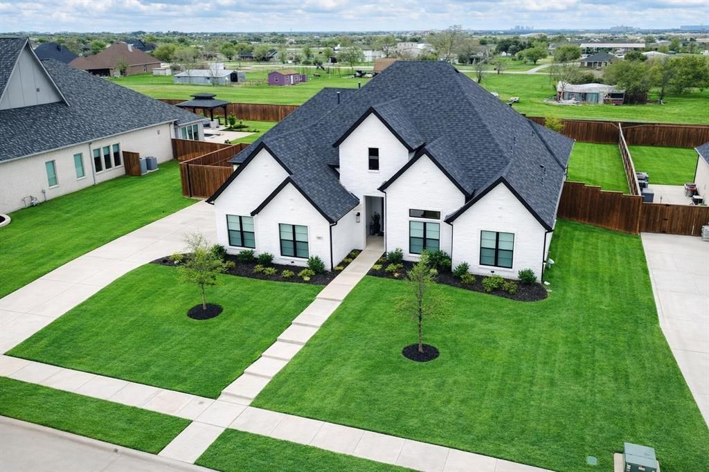 Custom-built 4-bedroom, 3.5-bath luxury home on half an acre in Haslet, located within Northwest ISD and just a short drive to Alliance Town Center. This thoughtfully designed home blends comfort and functionality with elevated finishes throughout, including wood flooring, crown molding, quartz countertops, plantation shutters, and electric shades. The light-filled great room serves as the heart of the home, featuring vaulted ceilings with a statement beam and a floor-to-ceiling brick gas fireplace. The kitchen offers a large island, farm sink, stainless steel appliances, double ovens, 5-burner gas cooktop, built-in wine cooler, under-cabinet lighting, and a spacious walk-in pantry. A built-in workspace just off the kitchen creates a convenient central hub. The primary suite includes a sitting area and a spa-inspired bath with dual vanities, soaking tub, oversized walk-in shower with dual showerheads, and his and her walk-in closets. A split floor plan provides added privacy, with a guest suite offering its own ensuite bath. Additional spaces include a private office with French doors and a media room complete with audio-visual components and surround sound. The outdoor living area is just as inviting, with a covered patio featuring a built-in gas grill, prep area, mounted TV, and fire pit, all overlooking the expansive backyard. Additional highlights include a large laundry room with sink, hall tree off the garage entry, 3-car garage with epoxy flooring, and a full security system. This is your opportunity to lease a truly beautiful estate. Book your private showing today!