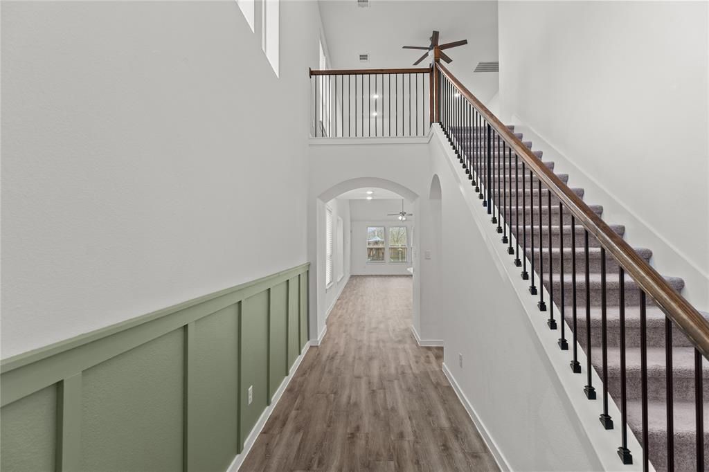 This beautiful 4-bedroom, 3-bath home sits on a desirable corner lot in Clements Ranch, directly across from peaceful green space. The open-concept layout features luxury vinyl plank flooring, vaulted ceilings, and a bright, spacious living area. The kitchen is perfect for entertaining with a large island, quartz countertops, ceramic tile backsplash, stainless steel appliances, and a gas range. The main-floor primary suite offers a relaxing retreat with dual vanities, soaking tub, separate shower, and walk-in closet. A secondary bedroom and full bath downstairs provide ideal guest space. Upstairs includes a versatile game room and two additional bedrooms. Enjoy the private backyard with a covered patio—perfect for relaxing or entertaining. Located in Forney ISD, this home blends comfort, style.