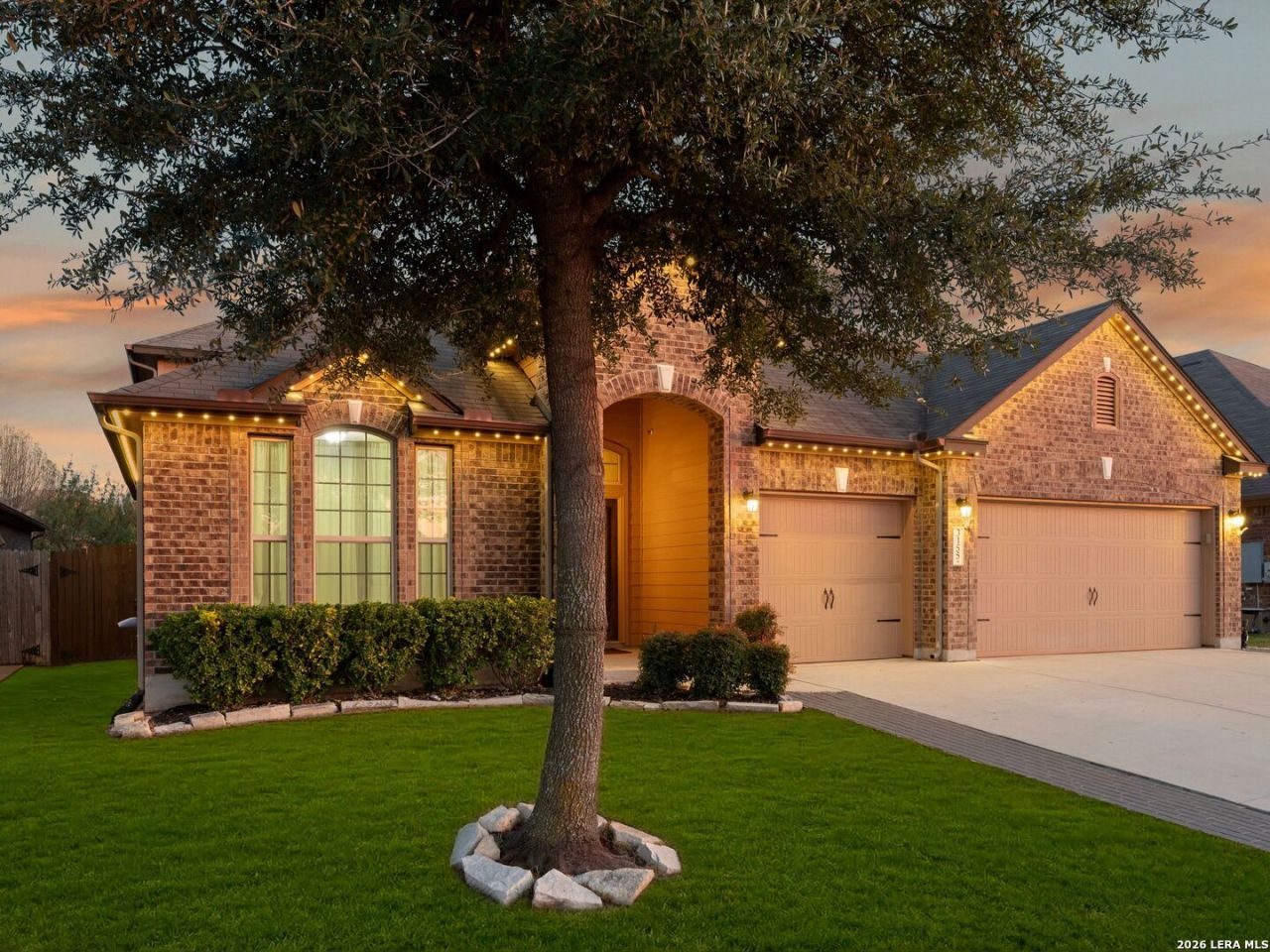 Tucked within a quiet cul-de-sac in the heart of burgeoning New Braunfels and the well appointed Highland Grove subdivsion, 3155 Sunset Cove presents a refined blend of elegance, comfort, and thoughtful design-just minutes from premier shopping, elevated dining, top-rated Comal ISD schools, and the charm of historic downtown. From the moment you arrive, mature trees, manicured landscaping, and a beautifully crafted paver walkway create a warm and inviting introduction. Inside, soaring tray ceilings and graceful architectural details set the tone, while arched windows along the living space frame serene backyard views and fill the home with natural light. Spanning 3,179 square feet, the home offers a seamless open-concept layout designed for both everyday living and sophisticated entertaining. The kitchen is well-appointed with stone countertops and stainless steel appliances, flowing effortlessly into the main living area and a spacious breakfast nook. A formal dining room and private office provide additional versatility and refinement. The thoughtfully designed floor plan offers multiple living spaces, including an expansive upstairs retreat complete with a private bedroom and full bath-ideal for guests or multi-generational living. Additional bedrooms on the main level are tucked away to ensure privacy and comfort. Outdoors, a covered patio overlooks a lush, meticulously maintained backyard, creating a peaceful setting for relaxation. A three-car garage and generous attic storage provide excellent convenience and functionality. The property sits just a minutes walk from the community playground and pool. Built in 2014 on a 7,405-square-foot lot, this home is as efficient as it is beautiful, featuring paid-off solar panels, permanent customizable exterior lighting, and consistently maintained HVAC, lawn care, and pest control systems. This residence offers a rare opportunity to enjoy a tranquil setting with close proximity to IH-35 for easy commutes and all that New Braunfels has to offer. Schedule your private tour today!