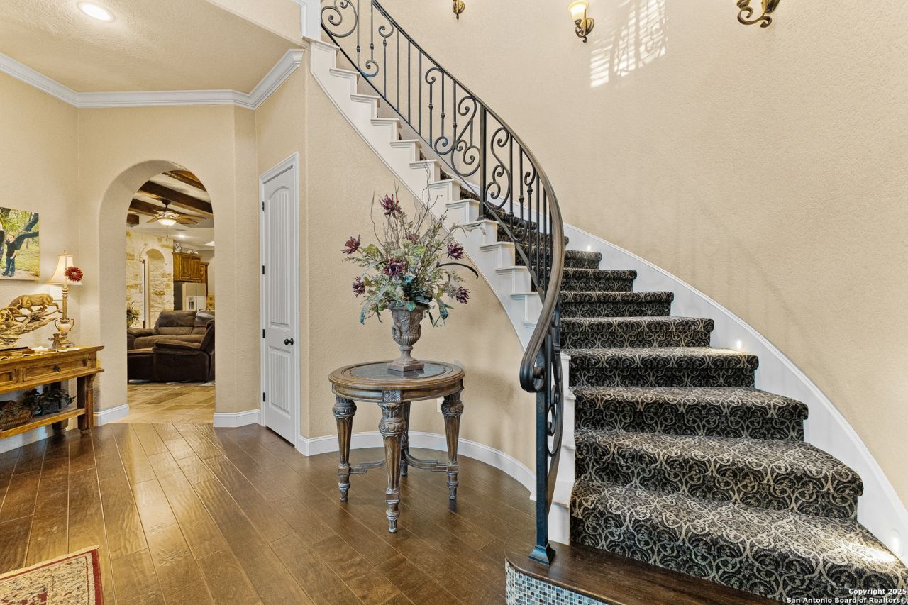 Experience elevated Hill Country luxury in this one-of-a-kind custom estate on a prime corner lot in prestigious Timberwood Park. From the grand iron doors and soaring ceilings to the dramatic circular staircase and refined architectural details, this home makes an unforgettable first impression. The open-concept design is perfect for entertaining, anchored by a chefs kitchen with dual oversized islands, a 6-burner gas cooktop with pot filler, double ovens, a built-in ice maker, a walk-in pantry, and a stylish dry bar. The private owners wing offers a serene retreat with a dedicated study, coffee-bar entry, spa-inspired bath with dual rain showers and soaking tub, and a custom walk-in closet. A downstairs guest suite adds flexibility, while upstairs features a spacious game room and three additional bedrooms. Outdoors, enjoy a covered patio with a fireplace and an outdoor kitchen plus a turfed sports cage for year-round fun. An oversized 3-car side-entry garage, circular drive, and walkable access to Timberwood Parks 30-acre private amenities-lake, pickleball, golf, pool, trails, and clubhouse-complete this exceptional luxury offering.