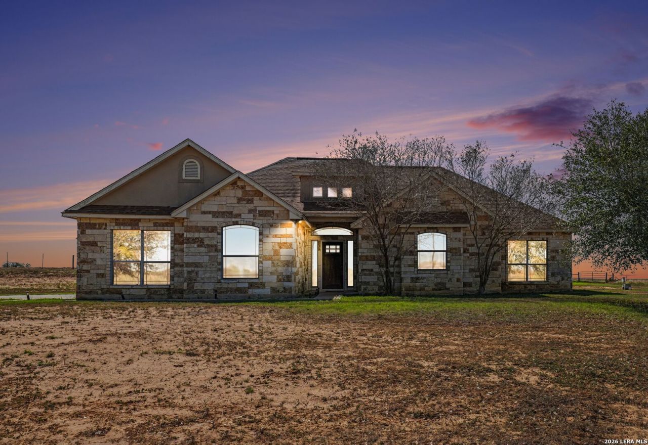 Welcome to your private slice of Texas countryside! Situated on 2 scenic acres in Floresville, this well-maintained 3-bedroom, 2-bath home, built in 2012, offers a rare combination of custom craftsmanship, modern comfort, and breathtaking hilltop views. From the moment you arrive, the striking four-sided dry stack cave stone exterior makes a lasting impression, setting this home apart with its unique character and curb appeal. Perched on a hilltop, the property offers sweeping views and a sense of privacy thats hard to find. Inside, the custom details continue with warm stone accents flowing through the kitchen and family room, creating a rich, inviting atmosphere. The island kitchen is designed for both everyday living and entertaining, featuring granite countertops, a built-in wine chiller, pot filler above the range, and a dedicated cooking space-perfect for those who love to cook and gather. Beautifully crafted cherrywood cabinetry with a deep, rich finish carries throughout the kitchen, bathrooms, laundry room, and pantry, showcasing a level of consistency and quality that reflects true attention to detail. The home is clean, well-maintained, and move-in ready, offering the benefits of newer construction without the upkeep concerns often found in older rural properties. With 2 acres of usable land, theres plenty of space to bring animals, park your RV or boat, build a workshop, or simply enjoy the open space and peaceful surroundings. Located just a short drive from San Antonio, this property delivers the perfect balance of quiet country living with convenient access to city amenities. Opportunities like this are rare-especially a custom, move-in ready home on acreage under $500K. Schedule your private showing today and experience the views, craftsmanship, and lifestyle this one-of-a-kind property has to offer.