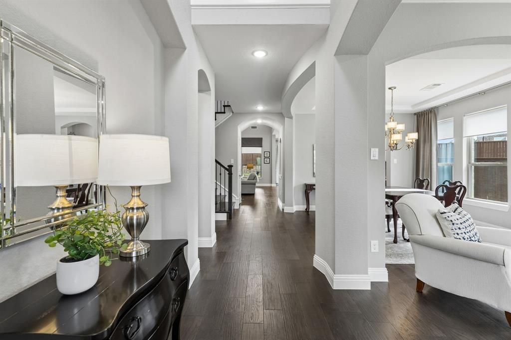 Built to bring people together, this home puts entertaining & outdoor living at the center of its design. Mornings start in the window-lined breakfast nook, and by evening the focus shifts to the outdoor living center with a built-in fireplace, sink and grill. Just beyond, a cedar cabana with privacy louvers sets the stage for outdoor dining, game nights, or relaxed evenings under the stars. Inside you'll find a thoughtfully designed haven with a clear sense of flow showcasing arched transitions, gleaming hardwoods, and a clean sightline into a two-story living space with a floor-to-ceiling fireplace and wall of windows that brings the outdoors in. The kitchen anchors the space with a curved granite island, gas cooktop, and double ovens. A butler's pantry with a wine cooler passes through to the dining area making hosting dinner parties easy. The owner's suite is set apart downstairs with a jetted tub, walk-in shower with granite seat, and a walk-in closet with built-in connecting to the laundry room. A second bedroom and full bath downstairs flex easily for guests or an office. Upstairs, a game room with a built-in wet bar, lighted cabinetry, and beverage fridge opens to a dedicated media space, with a pool table, mini fridge & media loungers that stay. Three bedrooms up have walk-in closets with ensuite or adjacent baths, and a built-in tech center that keeps the work off the kitchen counter. The cul-de-sac lot widens toward the rear, creating a flat, fenced backyard with room that's hard to find at this price point. Note the 2025 roof, tankless water heater, lots of storage & a 3-car tandem garage. Dominion of Pleasant Valley wraps it in 97 acres of parks, trails, and green space with a community pool, splash pad, playground, and pond. Woodbridge, Firewheel, and Waterview golf courses are minutes away, Muddy Creek Preserve trails, Lake Ray Hubbard and Lake Lavon are a short drive from the front door. This is a home built for the moments that become the memories.