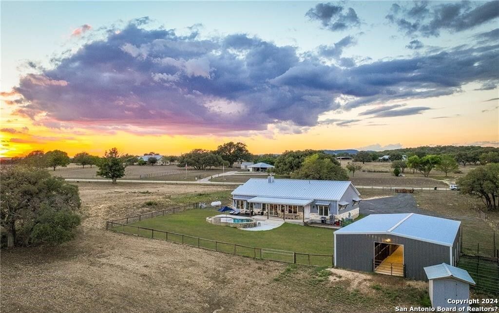 This turnkey Hill Country estate in the highly sought-after Montague Ranch Estates, just northeast of Bandera, offers a rare combination of improvements, usability, and lifestyle. Built in 2019, this 3,150 sqft single-story custom home features a well-designed 3 bed, 3.5 bath layout with an office, blending modern convenience with a true ranch setting. The home is equipped with smart technology throughout, including smart appliances, switches, and Cat5 wiring, while the oversized 3.5-car garage is insulated and climate-controlled. Out back, a custom pool and covered porch create the perfect setting to take in long-range Hill Country sunsets. Improvements on the property are built for both recreation and functionality, featuring a 6-stall Priefert barn with runs and tack room, a 35x35 shop with multiple roll-up doors, attached trailer storage, and a 150 x 250 lighted team roping arena. The land offers a strong mix of native habitat and usability, with a 1/2 -acre pond and free-ranging wildlife including whitetail, axis, and blackbuck. Whether youre looking for a full-time residence or a weekend retreat, this property delivers a hard-to-find setup in one of Banderas premier ranch communities.