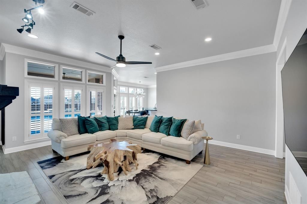 Gorgeous luxury residence! Premium upgrades across major systems, interiors, and outdoor living spaces! This home is designed for comfort and durability. Energy efficient, new 5-ton Lennox HVAC and full attic re-insulation (Sept 2023) as well as a new 3-ton Lennox exterior unit (July 2024). In May 2025 a new roof was installed featuring CertainTeed Class 4 impact-resistant shingles, new gutters, and a complete exterior trim repaint. Plumbing updates include a 2024 hot water heater replacement with all connections brought fully to current code. The interior has been reimagined with refined finishes, including elegant tile flooring throughout the downstairs (2021) and a full interior repaint. The gourmet kitchen features luxury Café appliances—including a double wall oven (2025), dishwasher (2024), and refrigerator (2024)—paired with a Frigidaire Gallery cooktop, black granite countertops, and a custom tile backsplash (2022). Upstairs enhancements include a new window, refreshed staircase railings, and a repainted media room. The primary suite was transformed in November 2025 with fresh designer paint and new statement lighting. All ceiling fans throughout the home have also been replaced. The outdoor living experience rivals a private resort. Pool was replastered in 2021, with rock trim repointed in 2025 and a new pump motor in 2024. In April 2025, a 4-speaker outdoor Bluetooth system was added. Infrastructure updates include a new septic main pump and float (2025), a Hunter Wi-Fi irrigation controller (2024), and professionally stained fencing and decorative wood structures (Oct 2024). This residence offers a rare blend of luxury finishes, major system upgrades, and refined outdoor living. The couch in the media room and all mounted TVs convey with the home. The washer, dryer, indoor and outdoor furniture are negotiable.