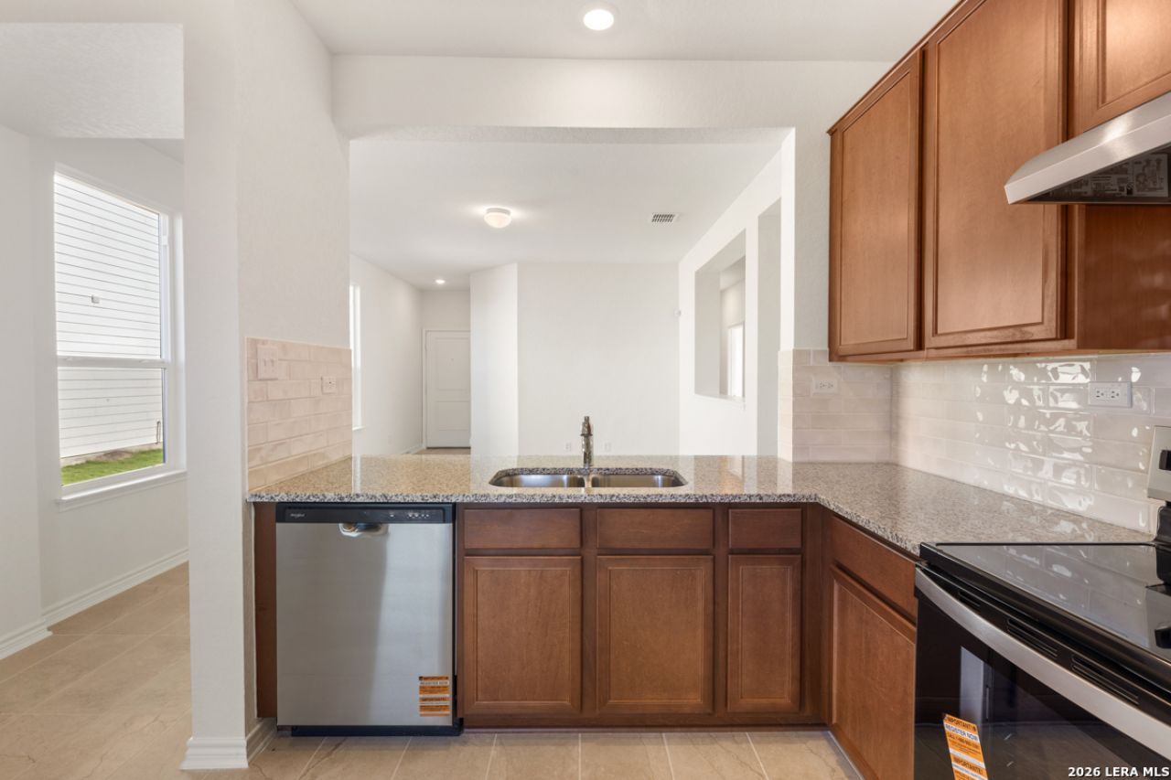 Step into comfort and style with this thoughtfully designed home featuring elegant 9-ft. first-floor ceilings and a Carrara style entry door. The kitchen boasts Whirlpool stainless steel appliances, Woodmont Cody 42-in. upper cabinets, a Daltile tile backsplash, and granite countertops in Arctic Pearl. The primary bath offers a raised vanity and a 42-in. garden tub/shower with a beautiful Daltile tile surround. Decorative touches include Kwikset Polo knob interior hardware and Stone Theory ceramic tile flooring. Enjoy added conveniences like a soft water loop, wireless security system, fully sodded yard, and an automatic sprinkler system.