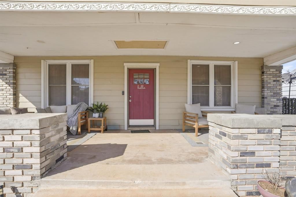 Originally built in 1930 and completely renovated in 2025, this single-family residence offers approximately 2,150 square feet of thoughtfully redesigned living space with 10-foot ceilings throughout. The living room features a stucco-finish fireplace, custom mixed-metal light fixture, & full-height 10-foot drapery, creating a striking focal point while remaining open to the kitchen for seamless flow.The kitchen is designed for both function and style, featuring painted cabinetry, stainless steel appliances, butcher block countertops, a breakfast bar, & a built-in banquette dining area. Custom rustic wood & copper lighting fixtures were professionally designed to complement the bar & banquette spaces.A dramatic hallway showcases wainscoting with reclaimed barn wood accents and is anchored by a 10-foot painted built-in library feature that draws the eye and adds architectural interest. Off the hallway are two spacious bedrooms with wood flooring, 10-foot ceilings, new chandelier ceiling fans, and custom floor-to-ceiling drapery. A full bath includes a tiled tub & shower combination with ceiling-height tile, painted vanity, built-in linen storage, and coordinating wainscoting. The professionally curated interior palette incorporates layered shades of gray & tan, accented with high-end silver hardware throughout.The primary bedroom is spacious has plenty of natural light , there is a brick accent wall & secret access to an side yard patio area. The primary bath is as roomy as is it luxurious . Two dualing vanites with lighted mirrors flank the main bath room . Vanities have been panited with antique ombre finish . There is a water closet for commode & a huge tiled shower with bench & high end gold finished plumbing fixtures. Just off the main bathroom is a large closet room . At the back of home is a Large living space used as a game & Media Room. There is a large Media screen , a built in Snack bar & overstuffed furnishings to get cozy & enjoy a movie .