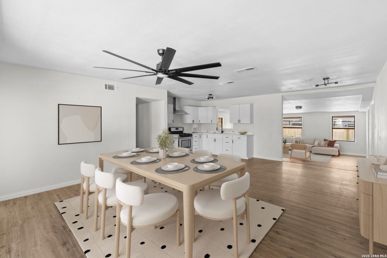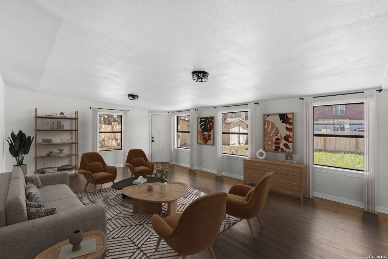 Beautifully remodeled single story home in San Antonio offering a modern open layout and thoughtful updates throughout with NO HOA. The spacious design features a large main living area that can function as a living room, game room, or living dining combo, providing flexibility to fit a variety of lifestyles. The updated kitchen showcases quartz countertops, stainless steel appliances, and modern finishes, all complemented by newer paint, flooring, and light fixtures that create a clean and cohesive feel. An additional versatile room with direct access to the garage offers the perfect space for a mud room, hobby room, or flex space. All bathrooms have been completely remodeled with updated tile showers, newer toilets, and stylish circular mirrors, adding a fresh and contemporary touch throughout the home. The property also includes a one car attached garage for added convenience. Step outside to a private backyard with a privacy fence and a detached shed that can easily serve as a workshop or extra storage space, expanding the functionality of the outdoor area. Ideally located with a short commute to Lackland Air Force Base, Randolph Air Force Base, Fort Sam Houston, and San Antonio International Airport, and offering easy access to Loop 410, this home combines modern updates, versatility, and convenience in San Antonio.