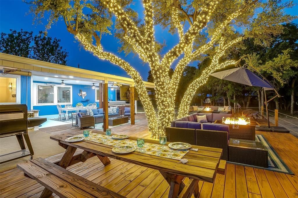 Exceptional waterfront estate on Palo Pinto Lake offering refined lake living, outstanding entertaining space, and proven short-term rental potential. The main home features open, light-filled living spaces, rich wood flooring, and stylish finishes, along with a separate private apartment for guests or added flexibility. Designed to accommodate up to 20 guests, the property is ideal for private enjoyment or continued income-producing use. Outdoor highlights include an expansive deck beneath mature oak trees with multiple seating areas, a covered lounge, a fire pit table, infrared heaters, outdoor TVs, and ambient lighting. Amenities include a 40x70 lighted pickleball and basketball court, a private dock, a private boat ramp, an 8-person hot tub, and a Sonos outdoor speaker system. Co-op water and a water well for irrigation. Offered as-is and substantially furnished for immediate enjoyment or investment use.