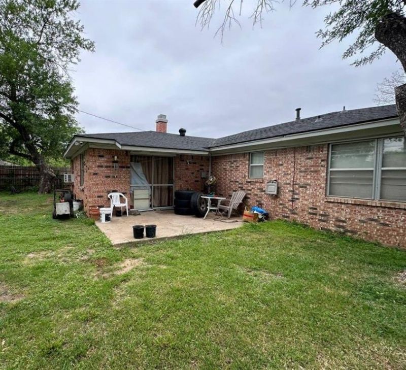 Solid brick 3-bedroom, 2-bath single-story ranch is located in the established Everman Park Addition. The home features an attached 2-car garage with a wide concrete driveway, providing plenty of parking. The large, fenced backyard includes mature shade trees, a concrete patio for outdoor entertaining, and a metal storage shed. Inside, the living room flows into a dining-den area with built-in shelving, while the kitchen offers a gas cooktop, wall oven, dishwasher, white refrigerator, and laminate counters. The master bathroom includes a walk-in shower with grab bars, and the second bathroom has a tub-shower combo. Additional features include ceiling fans, window AC units in bedrooms, carpeted bedrooms and living areas, and wood paneling that adds character. With central gas heat, central air conditioning, and a convenient utility closet with modern