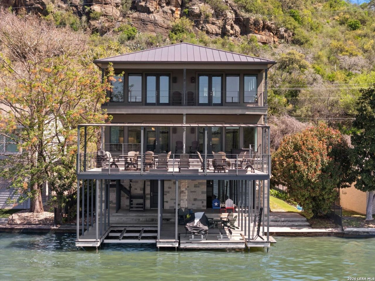 Improved Lake LBJ waterfront with hydraulic boat lift, two jet ski lifts, and open water views. Located on a quiet dead-end street below Look Out Mountain, this property offers a fully equipped shoreline and multiple outdoor living spaces designed for enjoying the lake. The waterfront includes a paddle board/kayak loading dock, swim ladder, temperature-controlled lakeside storage, and exterior stairway access. A partially covered overhead entertainment deck connects directly to the home, while multiple balconies and a covered lakeside patio provide scenic views of Lake LBJ and Packsaddle Mountain. Mature trees, wrought iron fencing, and a remote-control gated driveway add privacy and curb appeal. Inside, the home features three separate living areas-one on each level-ideal for hosting and everyday living. High ceilings, solid wood doors, engineered hardwood floors, and large tinted windows frame the lake throughout the home. The kitchen offers a quartz island with bar seating, KitchenAid black stainless appliances, gas cooktop, built-in oven and microwave, refrigerated drawers, and coffee bar. The main-level owners suite includes private balcony access and spa-style bath with soaking tub and walk-in shower. Dock setup ready. Elevated views. Lake LBJ lifestyle.