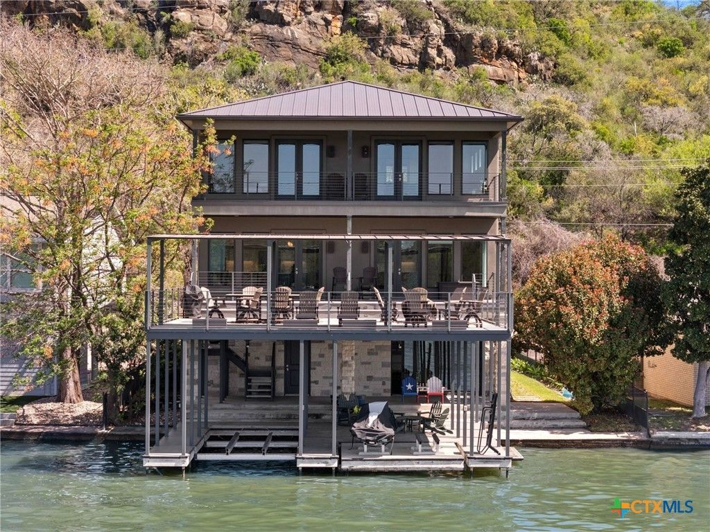 Premier Lake LBJ waterfront property with improved shoreline and elevated lake views. This Scenic Loop home combines thoughtful construction, efficient systems, and a waterfront setup designed for real time on the water. The shoreline features a hydraulic boat lift, dual jet ski lifts, paddle board/kayak dock, swim ladder, and locked temperature-controlled storage. Outdoor living includes a covered lakeside patio, overhead entertainment deck with direct indoor access, and multiple balconies capturing wide views across Lake LBJ and surrounding ranchland. The home offers three living areas across multiple levels, creating flexible space for entertaining and guests. Interior highlights include engineered hardwood floors, custom cabinetry, recessed lighting, and large dual-pane tinted windows framing the lake. The kitchen features quartz countertops, gas cooktop, built-in oven and microwave, refrigerated drawers, and custom cabinetry with lighting. The owners suite is located on the main level with private balcony access and spacious en suite bath. Improved waterfront. Strong construction. Lake LBJ ready.